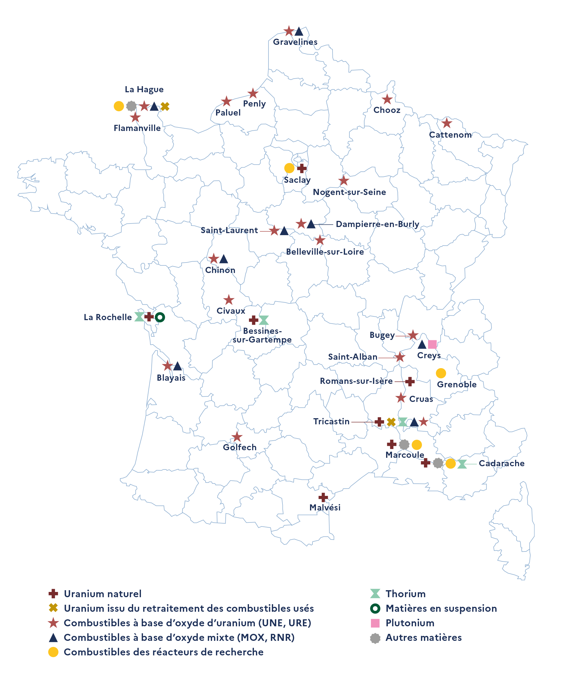 Les combustibles de la Défense nationale ne sont pas représentés sur cette carte. En effet, en vertu de la protection des informations dont la communication porterait atteinte aux intérêts mentionnés à l’article L. 124-4 du code de l’environnement, les localisations de matières ne peuvent être communiquées.